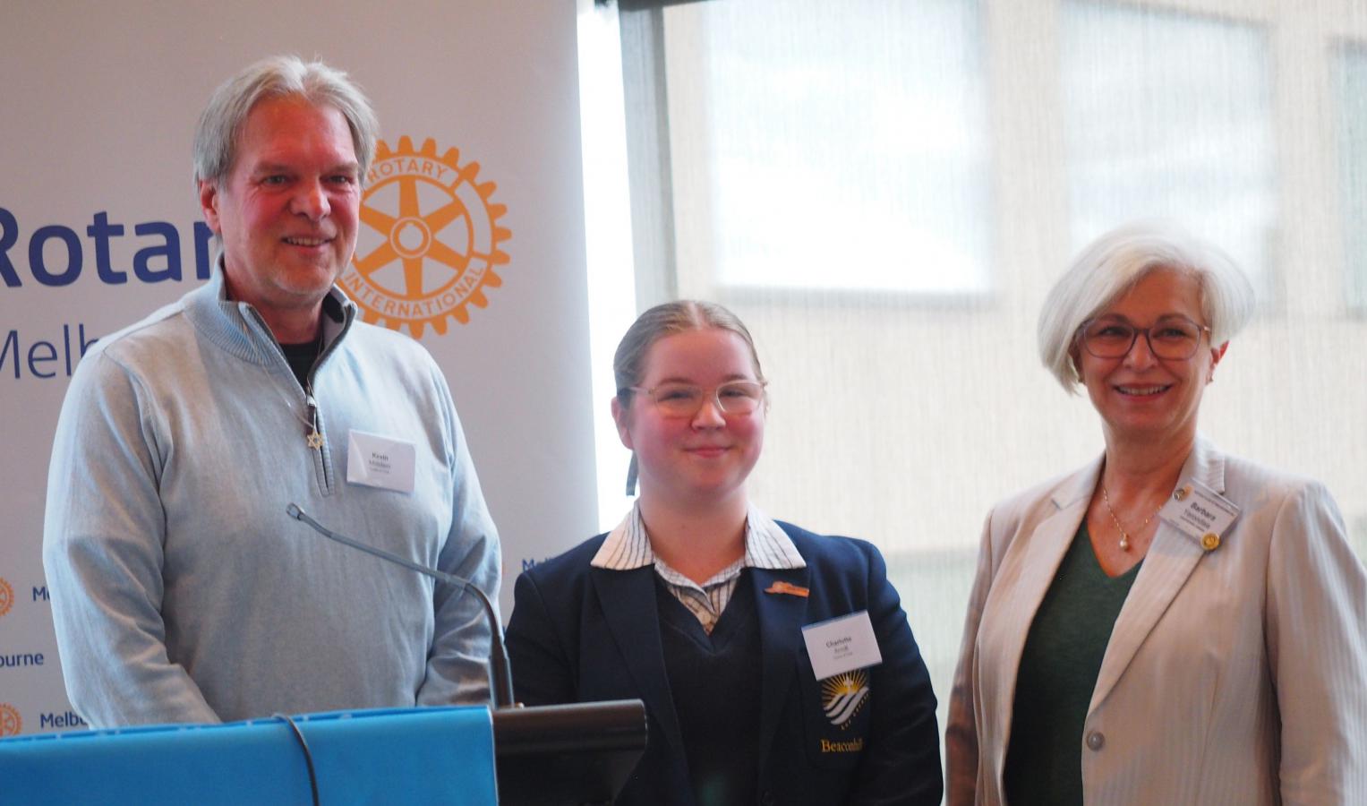 A highlight was the presentation of the 2025 Student Community Service Award to Charlotte Arndt from Beaconhills College. Initially nominated for the Environment Award, Charlotte was instead recognised for her exceptional community service initiative, Play It Forward Vic. Sparked by a holiday in Fiji, where she learned that village children lacked sports uniforms, Charlotte organised collections of pre-loved netball uniforms, successfully sending nearly 200 items to Fiji, outfitting multiple teams. Inspired by the project’s impact, she has launched a similar initiative for Samoa, supported by a Rotary grant of $2,000 plus matching funds for further fundraising. Charlotte outlined her detailed plans, fundraising efforts, partnerships with local clubs, and her professional approach to budgeting and logistics, earning admiration for her vision and leadership at such a young age.