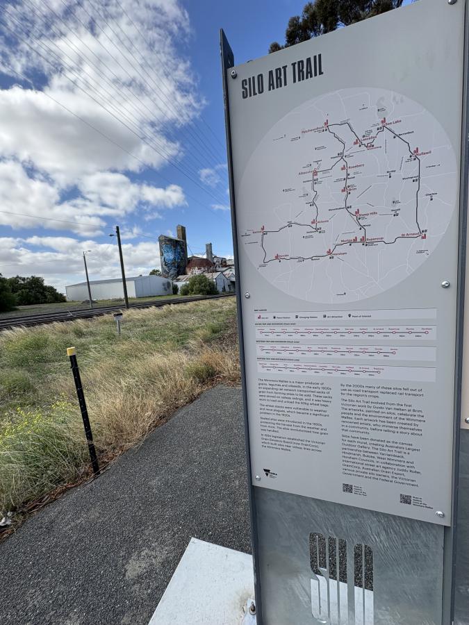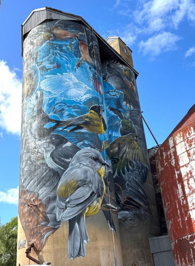 | Rupanyup’s silo art is the work of Russian mural artist, Julia Volchkova, who turned her attention to the town’s youth and their great love of team sport. The work vividly captures the spirit of community and provides an accurate insight into rural youth culture. |