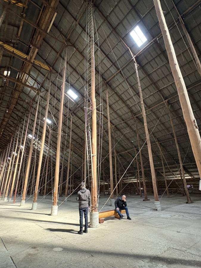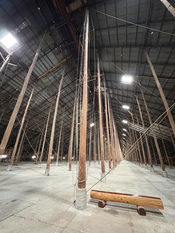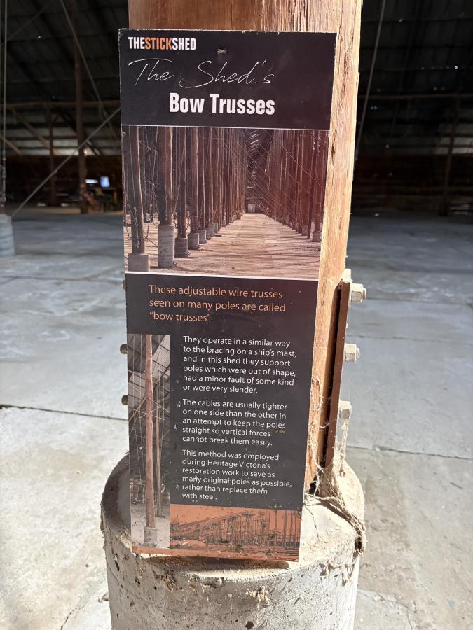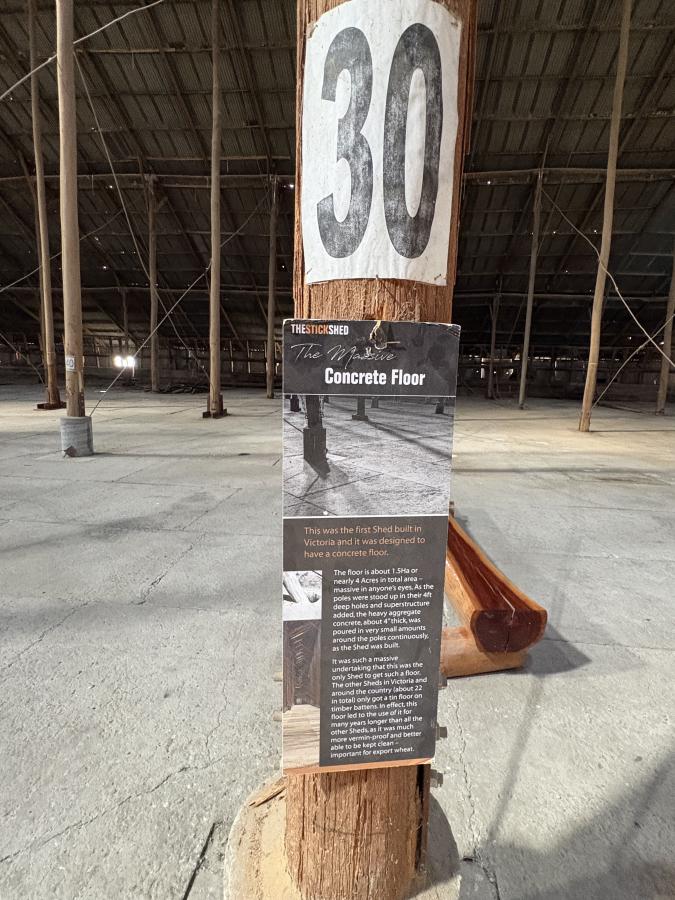 Day three, we travelled on to Murtoa. The standout here was the Murtoa Stick Shed. Built during World War II to store grain, the shed is an extraordinary, vast timber structure. Walking through its row upon row of tall timber poles gives you a real sense of both its scale and the ingenuity of its design. The Stick Shed is the 101st Australian icon included on the National Heritage List. Completed in 1942, the shed as designed was approximately 265 metres long, 60 metres wide, 19 metres high at the hip and held 3.5 million bushels or about 92,500 tonnes of wheat. Much of the building was constructed with little mechanical aid and a limited workforce due to the war. A steel shortage meant the shed was built largely from readily available timber, some 560 (56 rows of 10) unmilled mountain ash poles erected into the auger-dug footings in the ground.