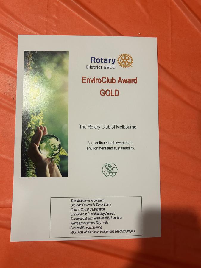 At the opening reception Sana Malik was presented with the District 9800 EnviroClub Award - Gold for continued achievement in enviroment and sustainability, covering the following projects The Melbourne Arboretum, Growing Futures in Timor-Leste, Carbon Social Certification, Sustainability Awards, Environment and Sustainability Lunches, World Environment Day raffle, SecondBite volunteering and 5000 Acts of Kindness indigenous seedling project.