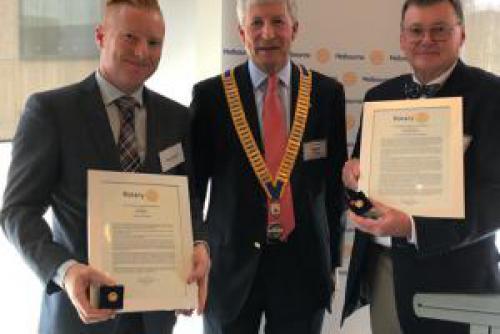 Club congratulations to Jason Balkin seen here with fellow Paul Harris awardee Hugh Bucknall and President Robert.