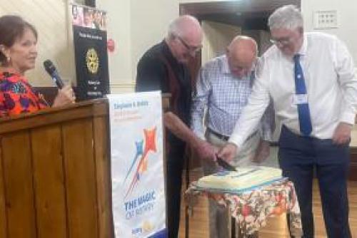 Rotary Melbourne Past President Clive and Helen Weeks attended Rochester Rotary's 60th Anniversary Dinner celebration along with 100 plus others on 23 November in the Rochester Shire Hall following its postponement earlier in the year. The hall was beautifully decorated with Rotary memorabilia including dozens of banners from other clubs.