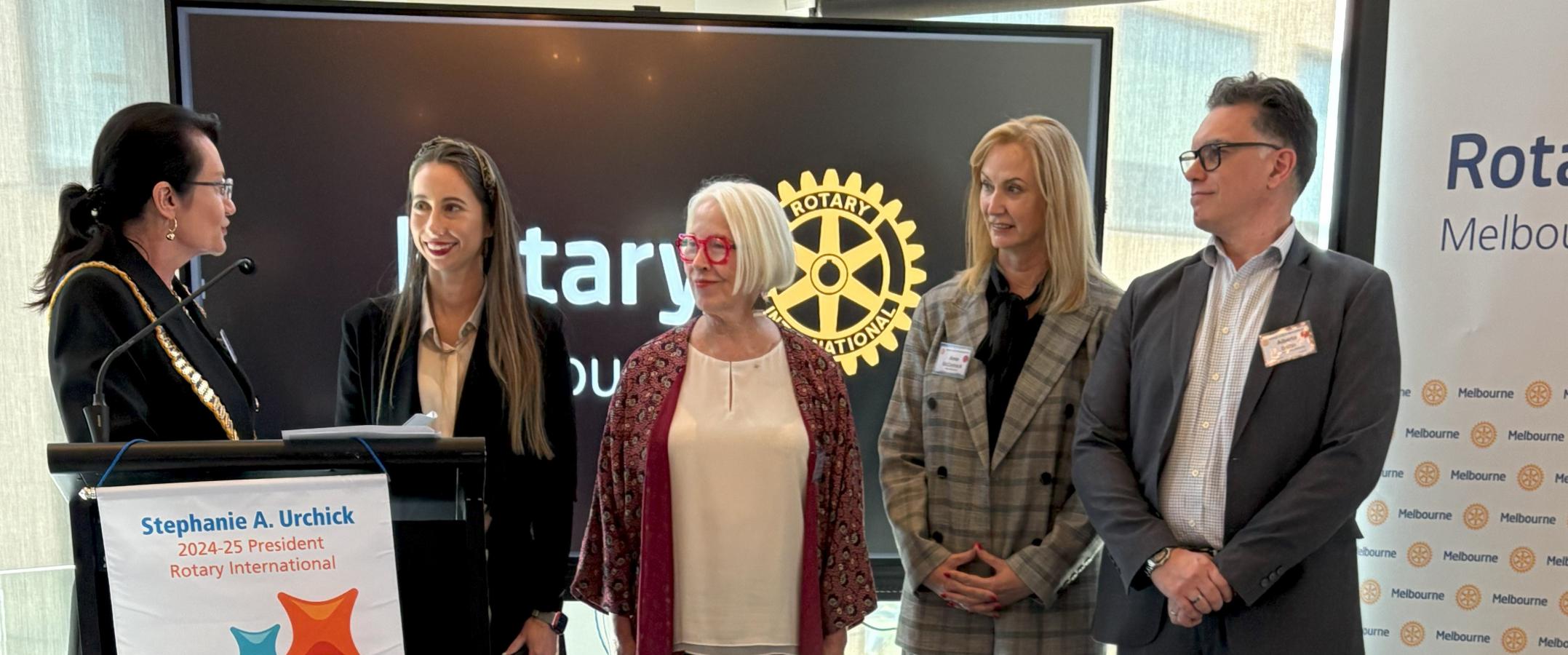 President Catherine then invited Stephanie Hunt, Alberto Balbo, Anne McCormack and Anne O’Donovan to come forward for induction into Membership of the Club accompanied by their sponsors, Sana Malik, Past President Chris Sotiropoulos and Susan Barton to the podium.
