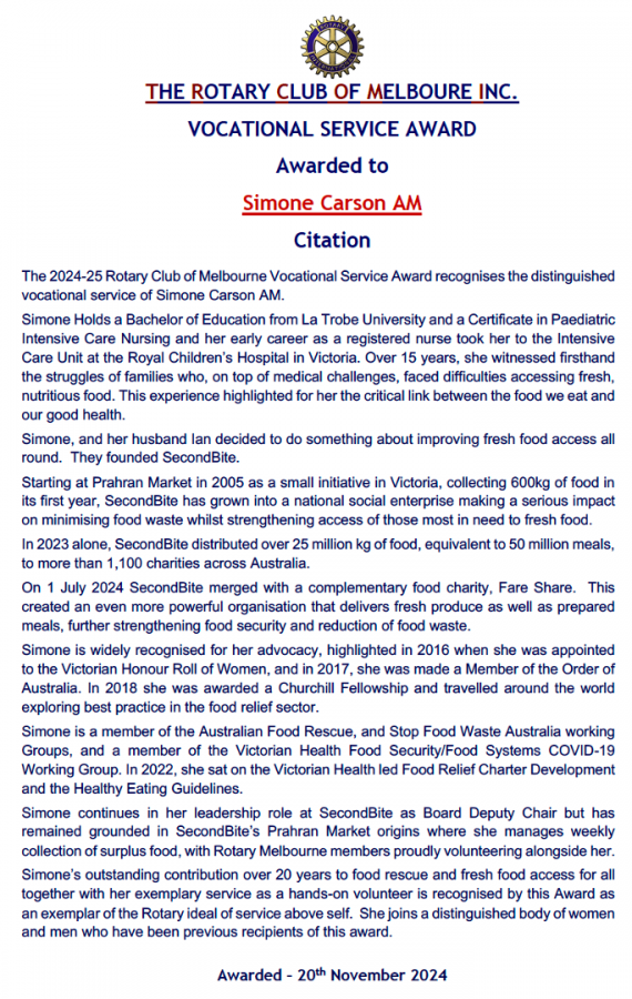 Simone was awarded the Vocational Service Award 2024 in recognition of her outstanding contribution to food rescue and fresh food access. Click here to read the full Award citation.