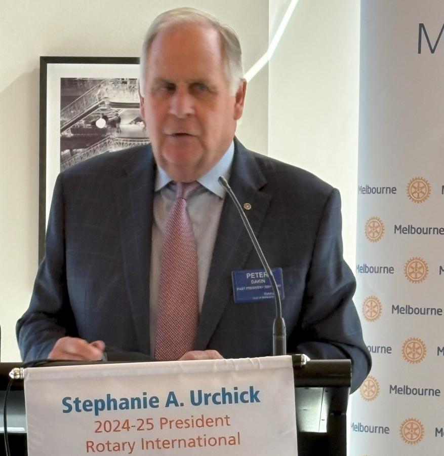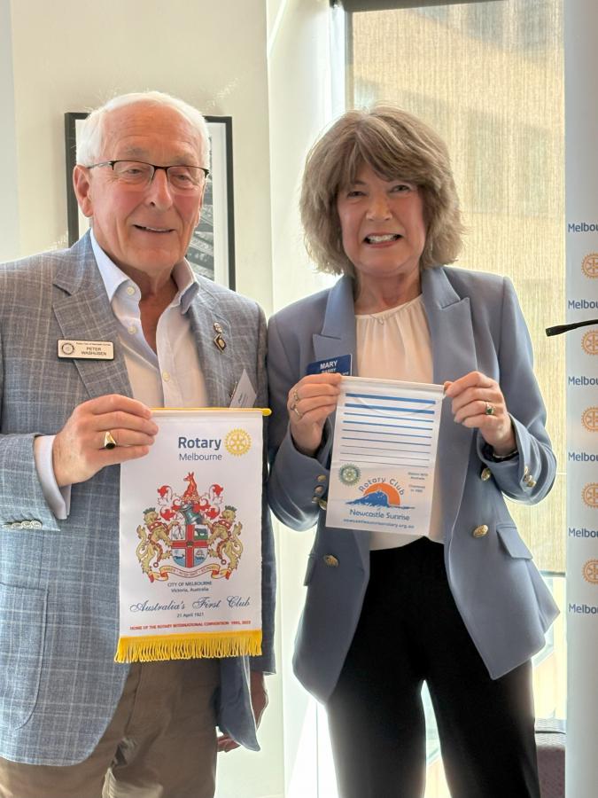 The meeting was opened by MC Peter Dakin with the acknowledgement of traditional owners and those present. Tony Battaini delivered the weekly reflection, the transcript of which is included later in this bulletin. VP Mary Barry deputised for President Catherine proposing the loyal toast, and returned to the podium to welcome members and guests, in particular guest speaker AK Tareen, and two former members and Club Directors, Daryl Hawkey and Peter Washusen and his wife Bev. Peter and Bev have moved to Newcastle where Peter is now President of the Rotary Club of Newcastle Sunrise. Peter and Mary exchanged banners in the usual way.