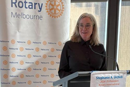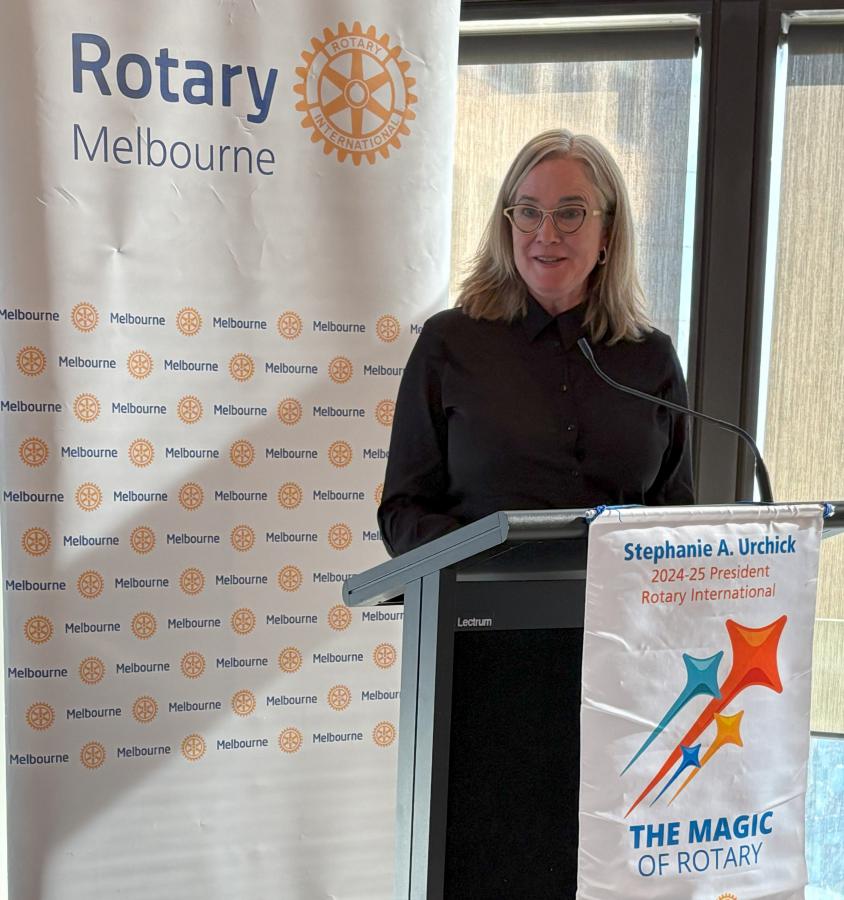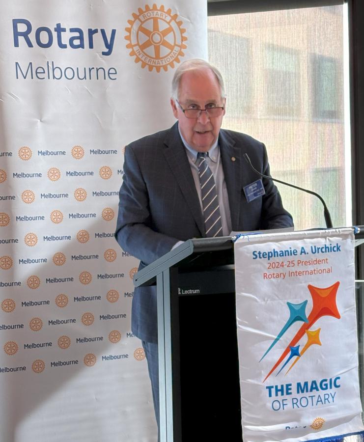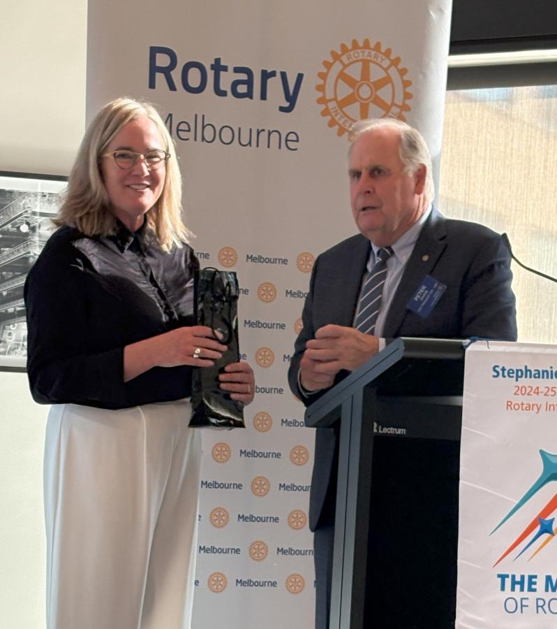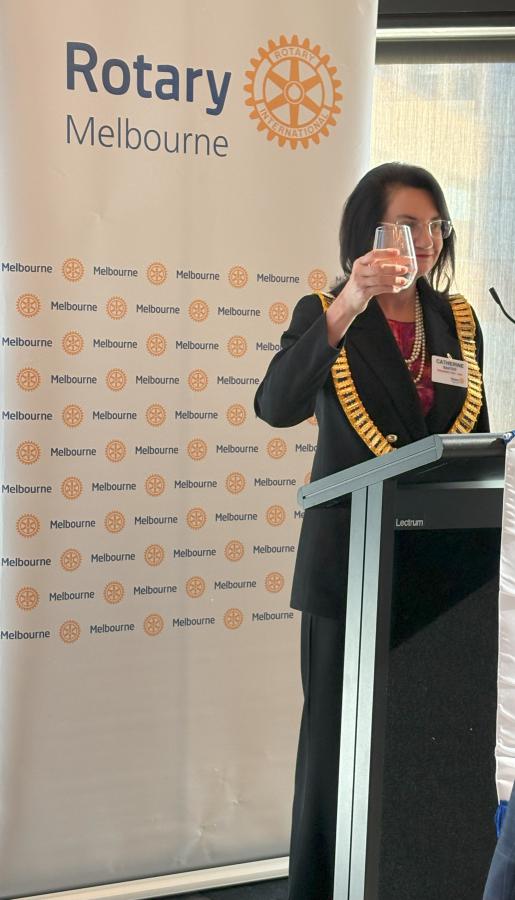 President Catherine came to the podium to propose the Loyal Toast. Following the meal service President Catherine welcomed members, visitors and guests to this meeting. She invited PP Reg Smith to provide an update on the World Environment Day lunch on 11 June 2025 following which President Catherine congratulated Reg on his service through the Club since joining in May 2008. Catherine reminded members to get their updates for the 2025-26 Member directory into the office urgently.