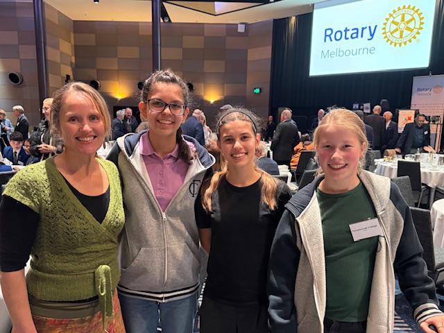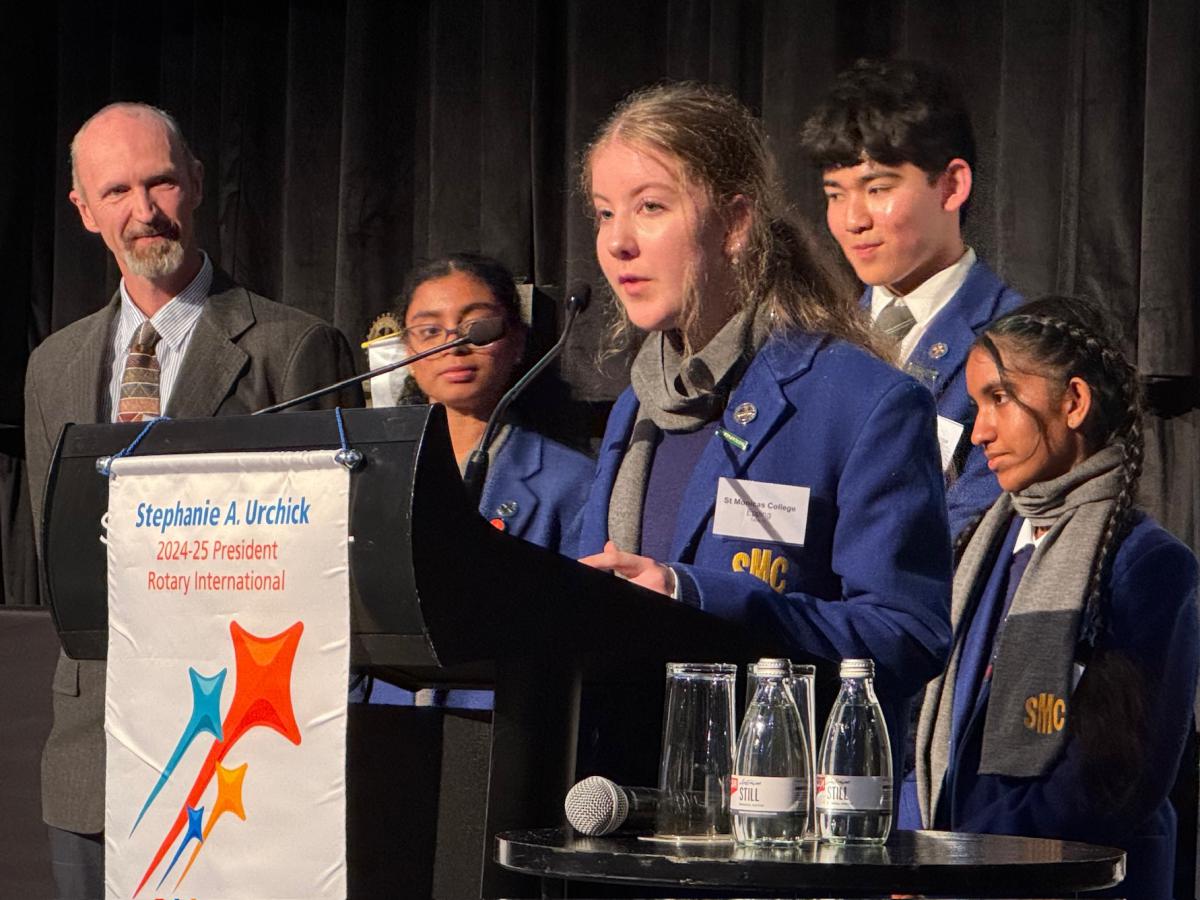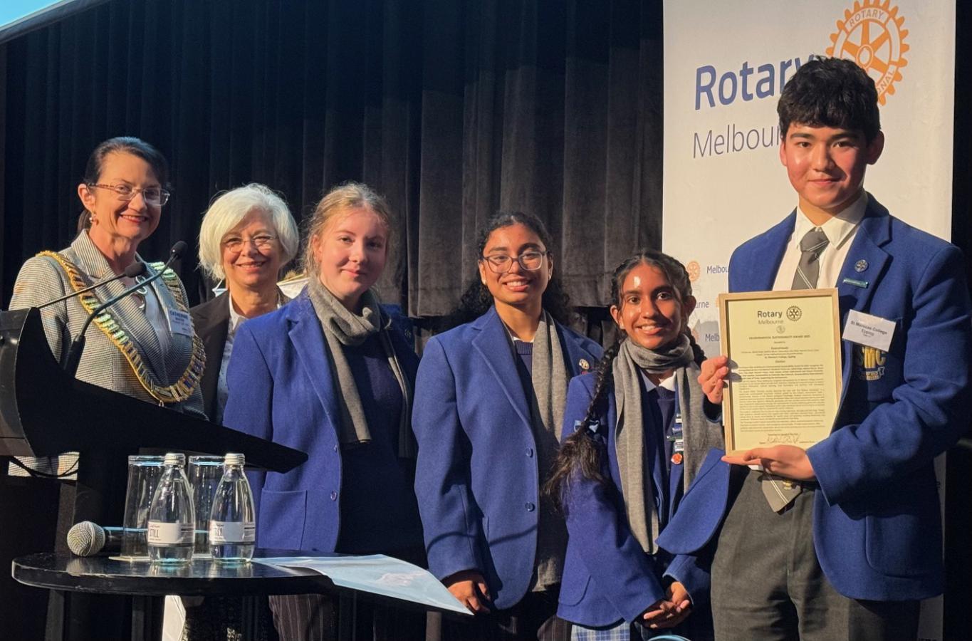 The Rotary Club of Melbourne Environmental Sustainability Award for 2025 recognises the distinguished service of St Monica’s Students Teresa Lau, Saheb Singh, Nathan Murer, Amna Raza, Aira Patel, Hannah Cleary, Clare Joseph, Arman Hajihashemi and Chesna Fernando, and their teacher, Sustainability Co Ordinator Ben Coleman, towards Rotary International’s Seventh Area of Focus, Supporting the Environment.