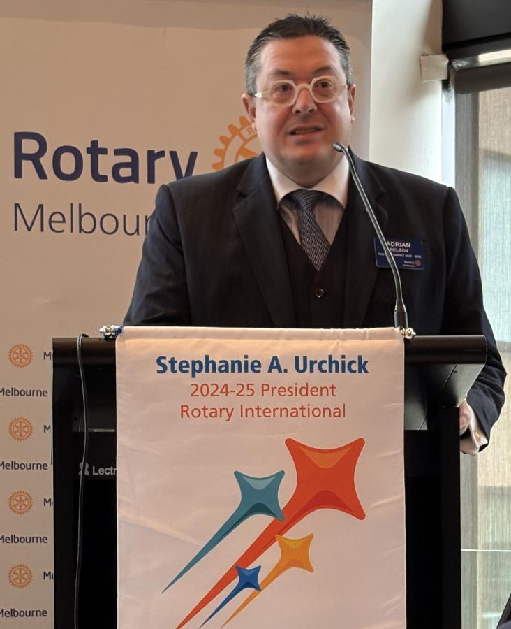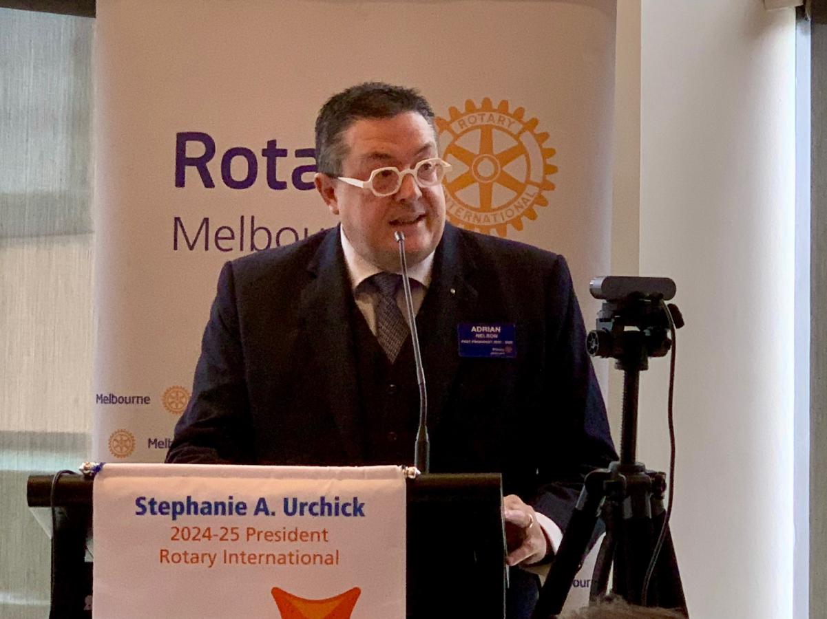 Master of Ceremonies began the meeting paying respect to the traditional owners of the land on which Rotary Melbourne meets. Past President Adrian Nelson delivered the weekly reflection, which can be read later in this Bulletin. Past President, and 2024-25 Vice President Mary Barry, proposed the loyal toast, and adjourned for the meal service break.