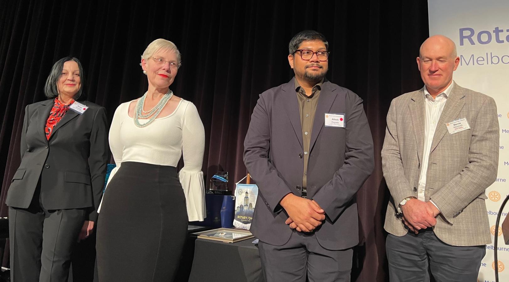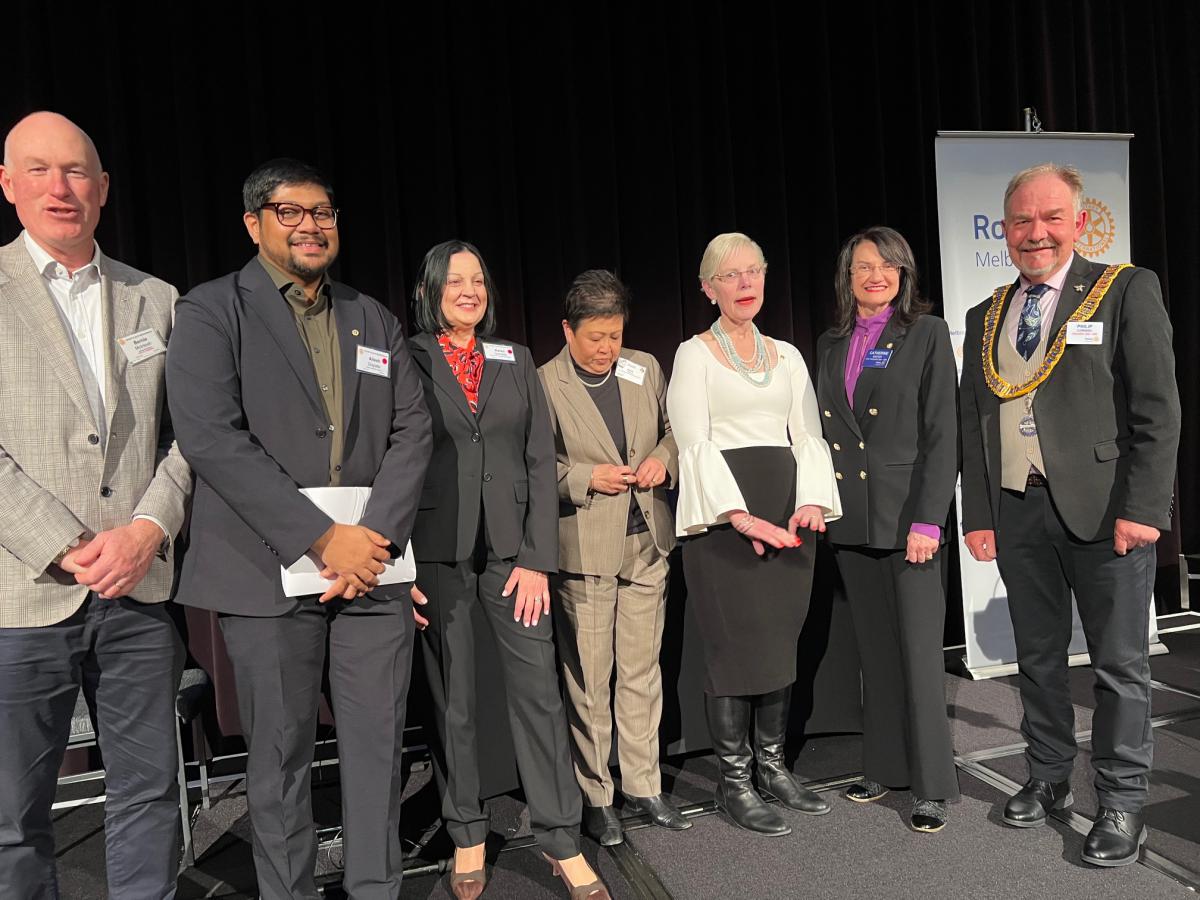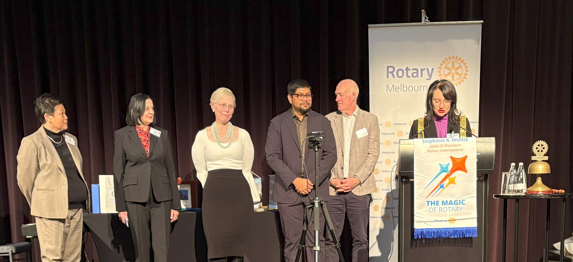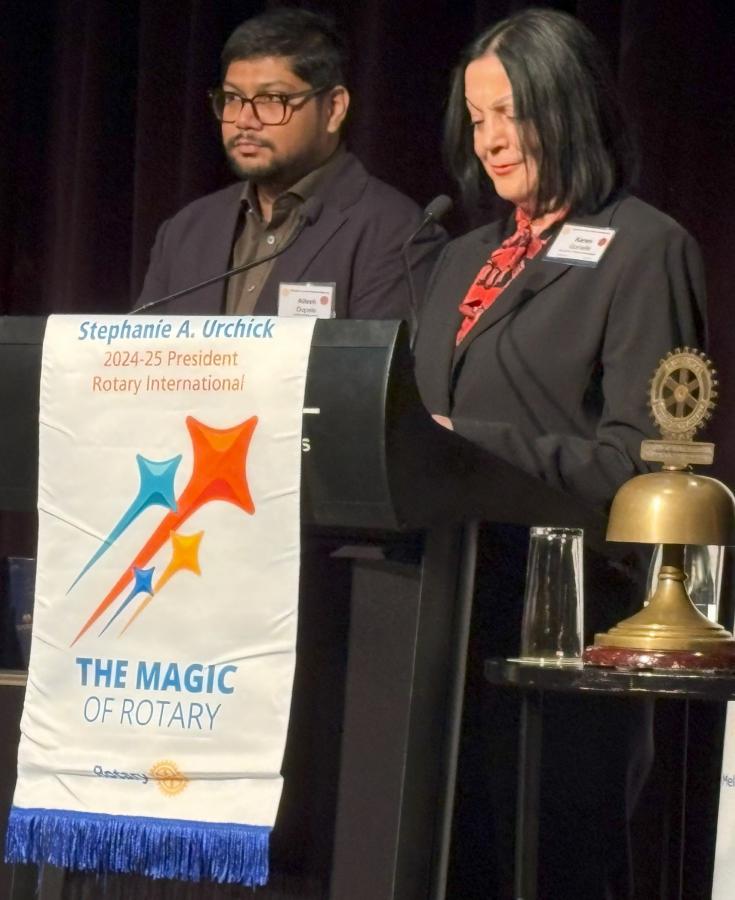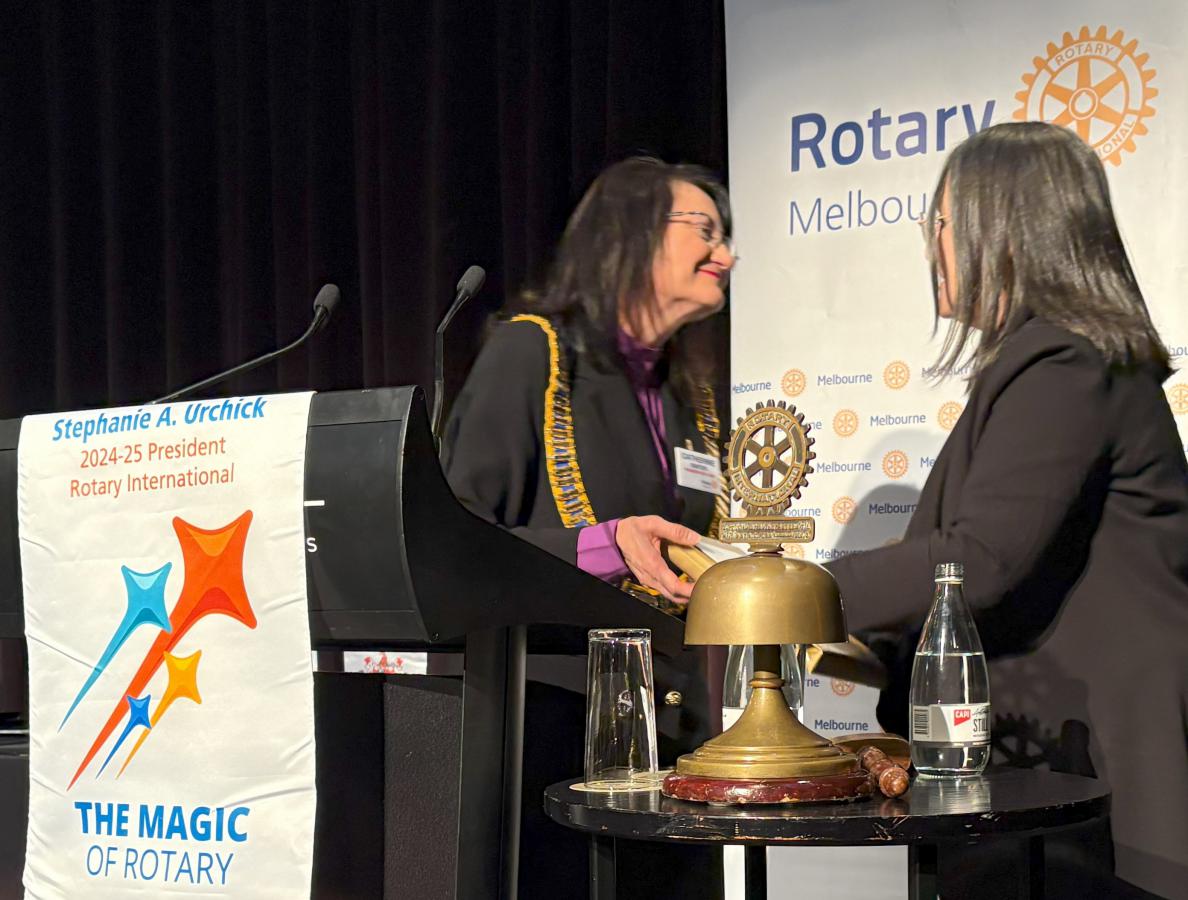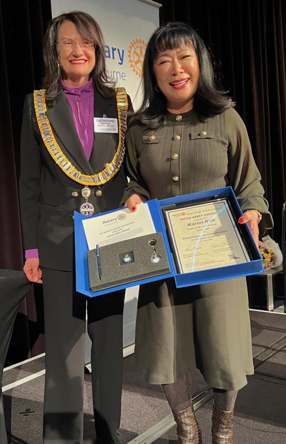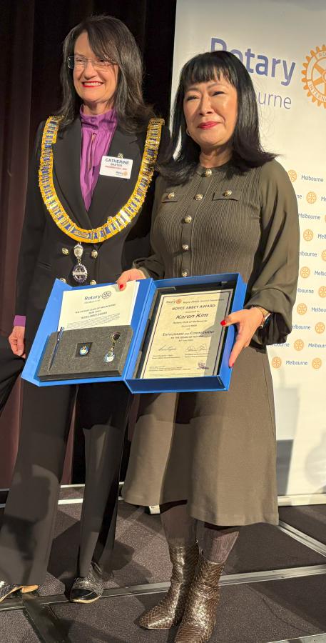 President Catherine then invited Karen Kim to return to the podium to be presented the 2025 Rotary Melbourne Royce Abbey Award which recognises a newer Club member who shows enthusiasm, commitment, and dedication to Rotary ideals. To view Karen’s citation, click here.