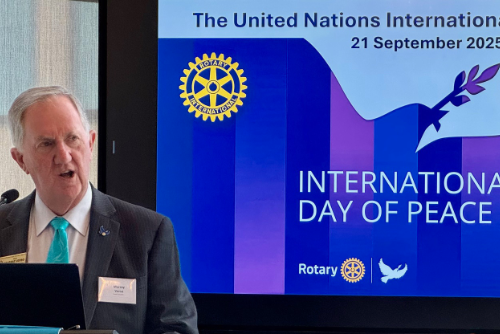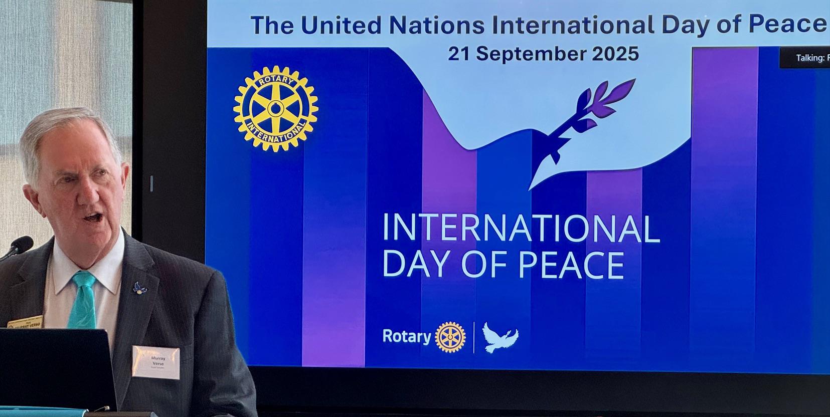 Murray began by highlighting Rotary’s deep and enduring commitment to peacebuilding, both historically and in contemporary practice. His remarks coincided with the United Nations International Day of Peace, and Rotary’s role in promoting peace in a turbulent world.