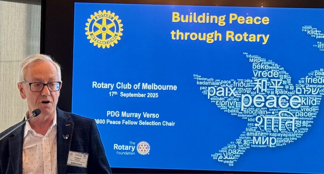Murray also described complementary Rotary initiatives: Peace Builder Clubs and Districts, Peace Poles in schools and public spaces, the Peace Park in Melbourne, and the Peace Bells project, which symbolise and encourage reflection and peace education in local communities.