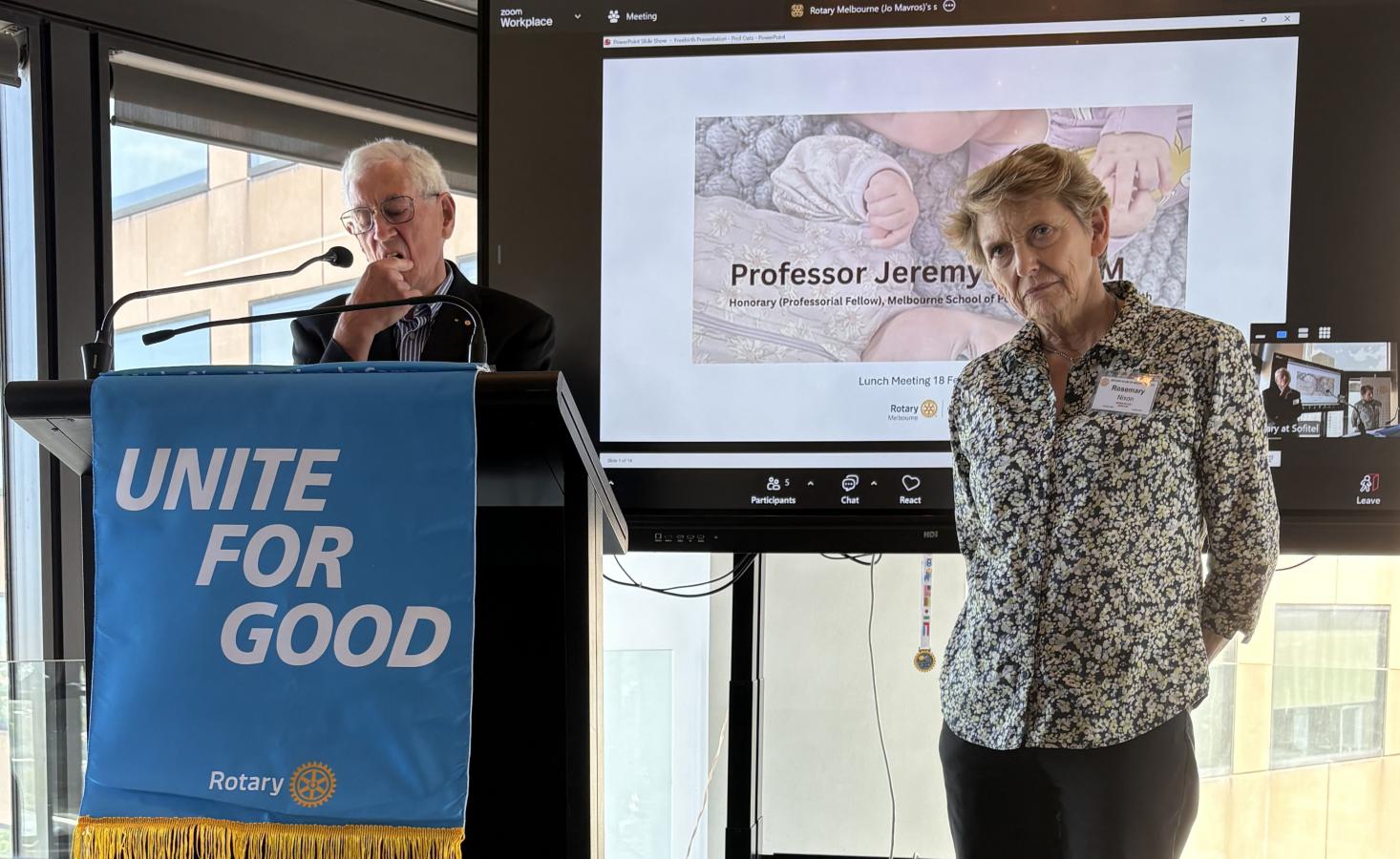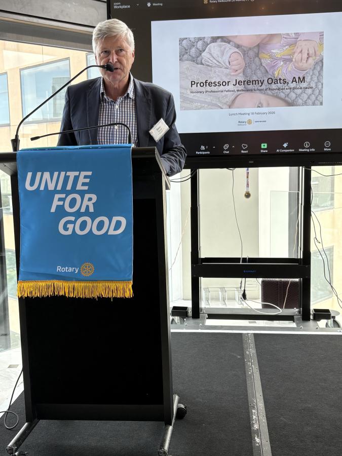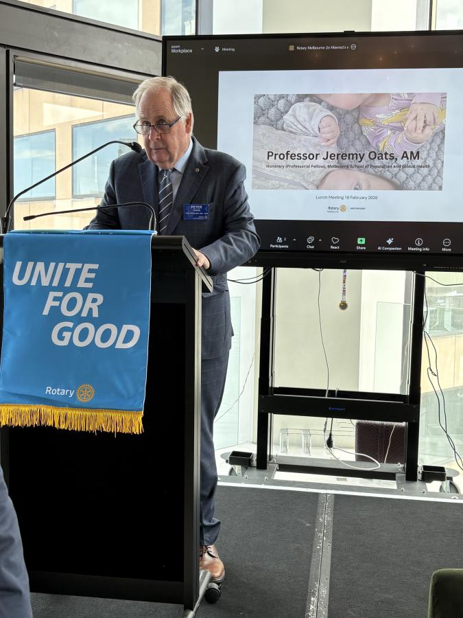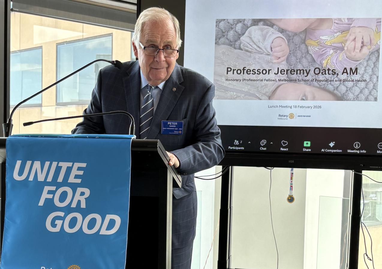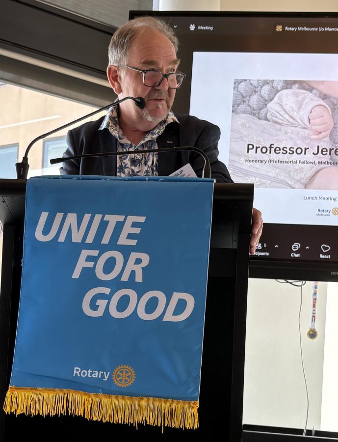 Dr Rosemary Nixon, AM, then came to the podium and delivered a light-hearted introduction of Professor Jeremy Oats AM, a Rotary Melbourne member and highly respected and acclaimed Obstetrician as guest speaker.