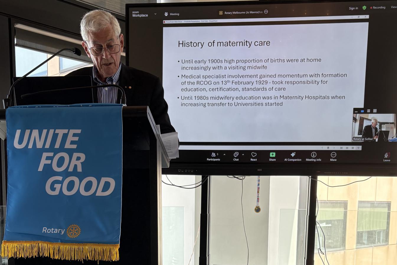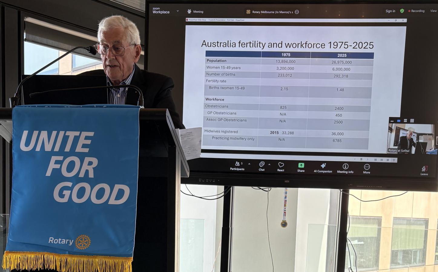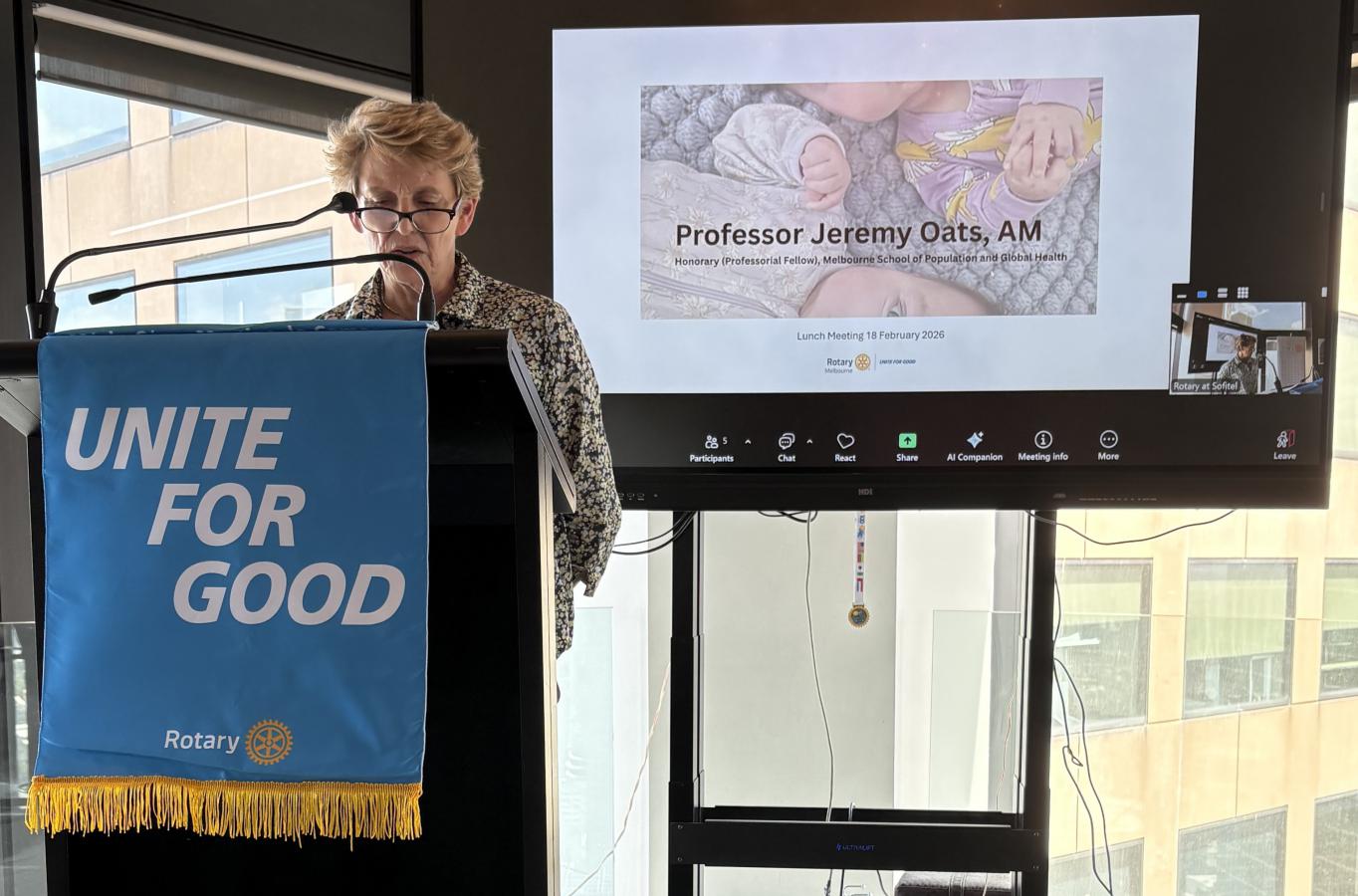 Dr Rosemary Nixon, AM, then came to the podium and delivered a light-hearted introduction of Professor Jeremy Oats AM, a Rotary Melbourne member and highly respected and acclaimed Obstetrician as guest speaker.